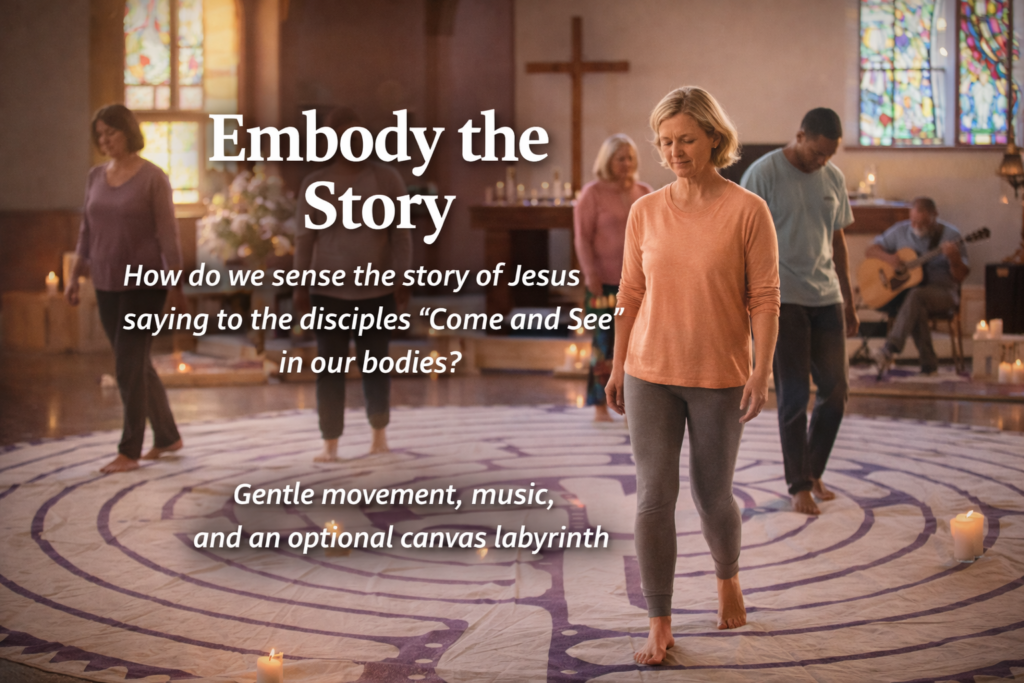 How do we sense the story of Jesus saying to the disciples “Come and See” in our bodies? We’ll use gentle movement and a variety of music to explore the Scripture. This workshop is adaptable for all bodies, and includes an option to walk a canvas labyrinth.