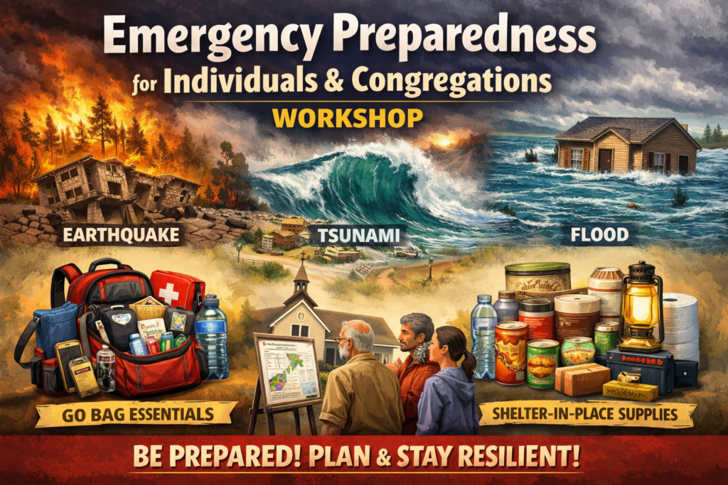 How do we prepare for disasters such as wildfires, earthquakes, tsunamis, and floods? What should be in your Go Bag, and what should you be storing in case you have to shelter in place for a while? Come get tips and add insights about how we can prepare our congregations to be resilient in such times.